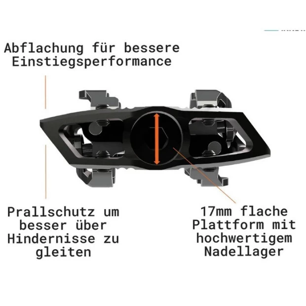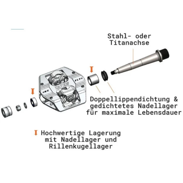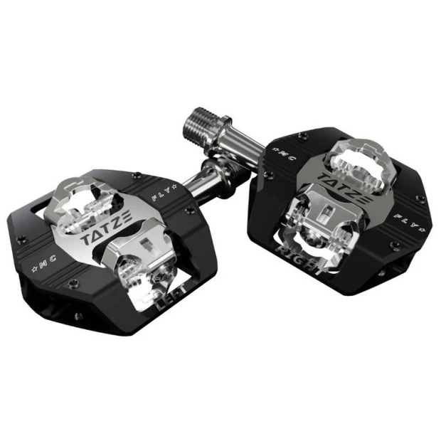 Les pédales automatiques Tatze Mc-Fly ont été spécialement conçue pour le Trail et l’Enduro. Très légères, elles offrent une grande surface de contact pour une connexion parfaite avec les chaussures. Cette connexion garantit un contrôle maximal du vélo. Les Mc-Fly sont compatibles avec les cales SPD et offrent un liberté angulaire de 5°, garantissant une grande liberté de mouvement pour un style de conduite actif. L’angle de déclenchement de 12° laisse suffisamment d’espace pour toujours maîtriser la situation entre les enclenchements et les sorties. Utilisées avec succès par Kevin Maderegger, ces pédales permettent également d’installer des pitons autour du mécanisme de clic pour un meilleur contact entre les chaussures et les pédales. Grâce à ces broches, fini le jeu de la chaussure. Les roulements à aiguilles à l’intérieur et les roulements à billes à gorge profonde à l’extérieur, ainsi que les multiples joints, assurent une grande longévité à ces pédales.